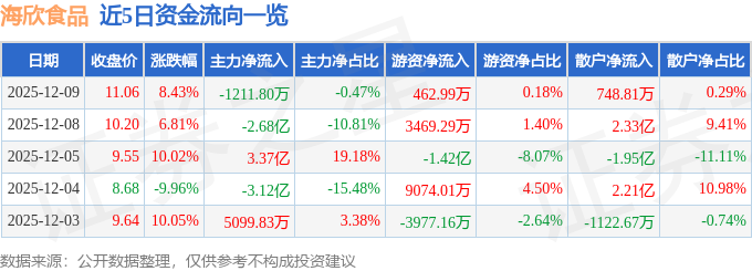 证券之星12月10日盘中动静,11点4分海欣食物(002702)触及跌停板。其所属行业食物加工目前下跌。领涨股为交大昂立。该股为地摊经济,食物,预制菜概念热股,当日地摊经济概念上涨0。3%。12月9日的资金流向数据方面,从力资金净流出1211。8万元,占总成交额0。47%,占总成交额0。29%。